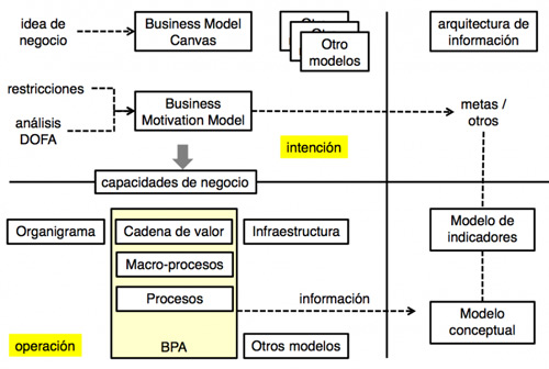 Los procesos de negocio son el corazón de cualquier organización y el centro de su arquitectura: son la conexión entre el modelo de negocio y el modelo operativo (personas, tecnologías, recursos) y son también el punto donde se hacen evidentes los aciertos y los problemas en el diseño de la empresa. Si la empresa tiene problemas, por ejemplo con sus recursos tecnológicos, esto se verá reflejado en procesos ineficientes y poco confiables. De igual manera, si queremos resolver problemas en una organización, el lugar natural para empezar a estudiar lo que está sucediendo y plantear estrategias de mejoramiento ajustadas a la realidad de la organización es la arquitectura de procesos. Si esta no es clara, es muy posible que se introduzcan nuevos y costosos componentes tecnológicos que no resuelvan ninguno de los problemas de fondo.
